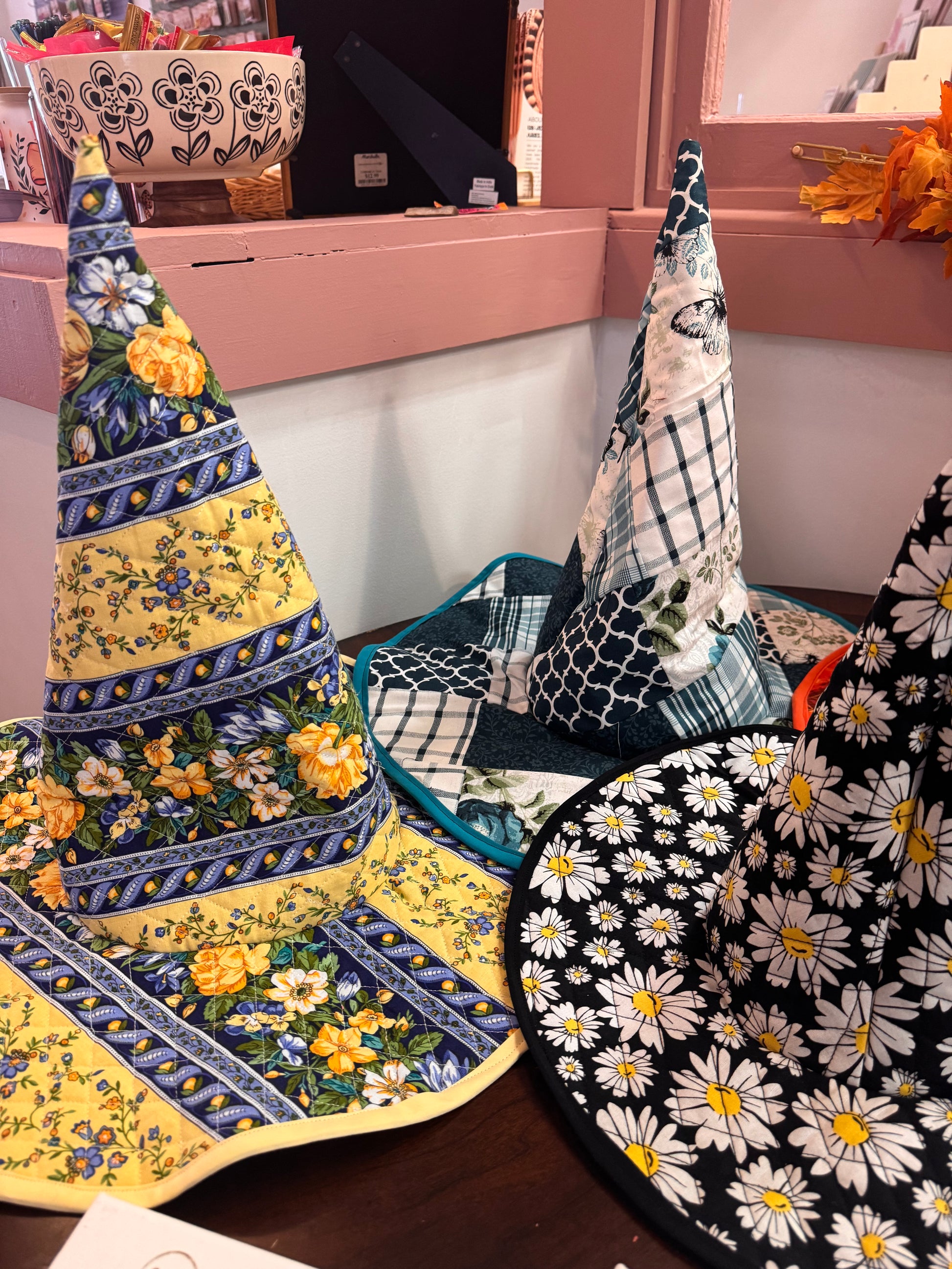 Hand sewn quilted witch hats